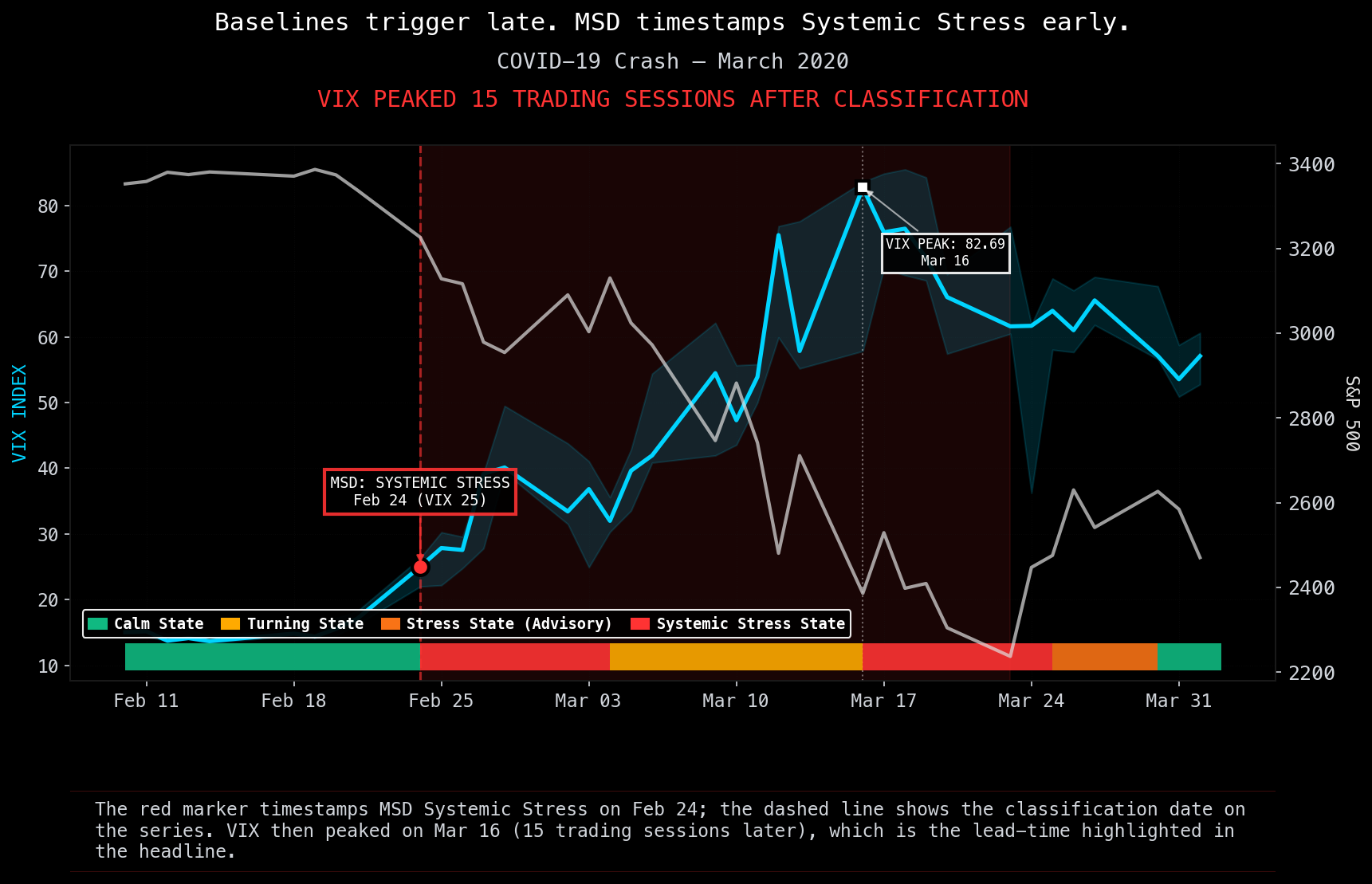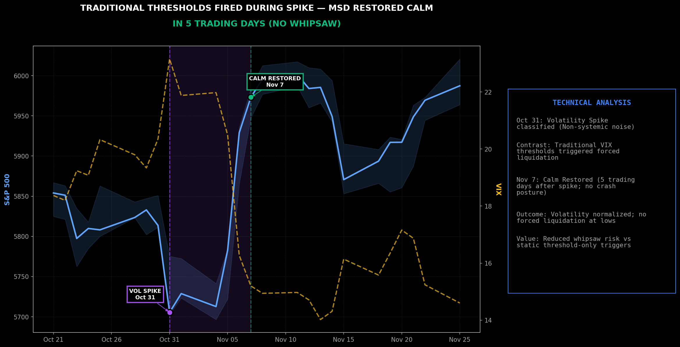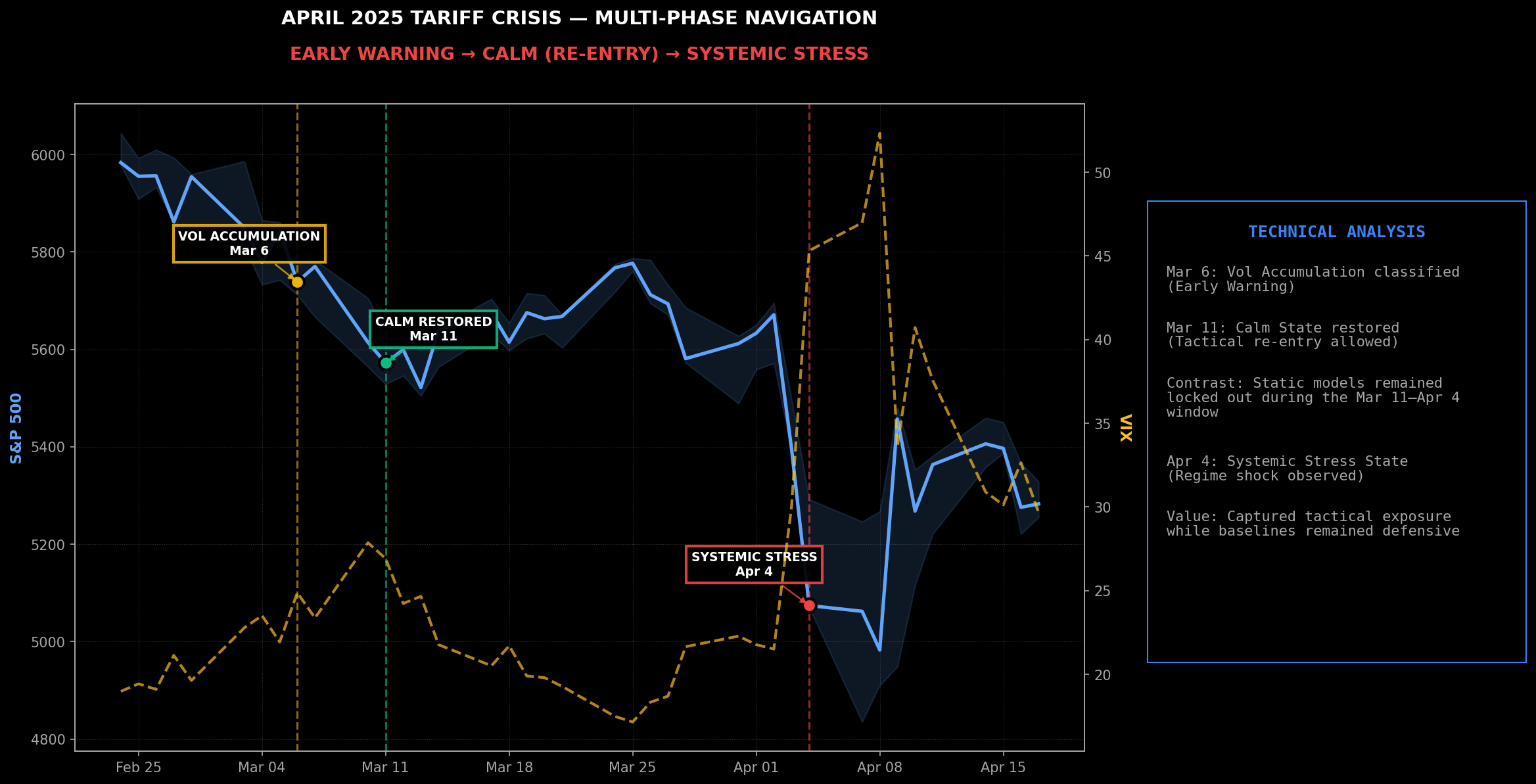 Backtest window: 2012–2024 + 2025 OOS • 100% hit rate (Systemic Stress), 93% (Vol Spike) • mindforge.tech/terms