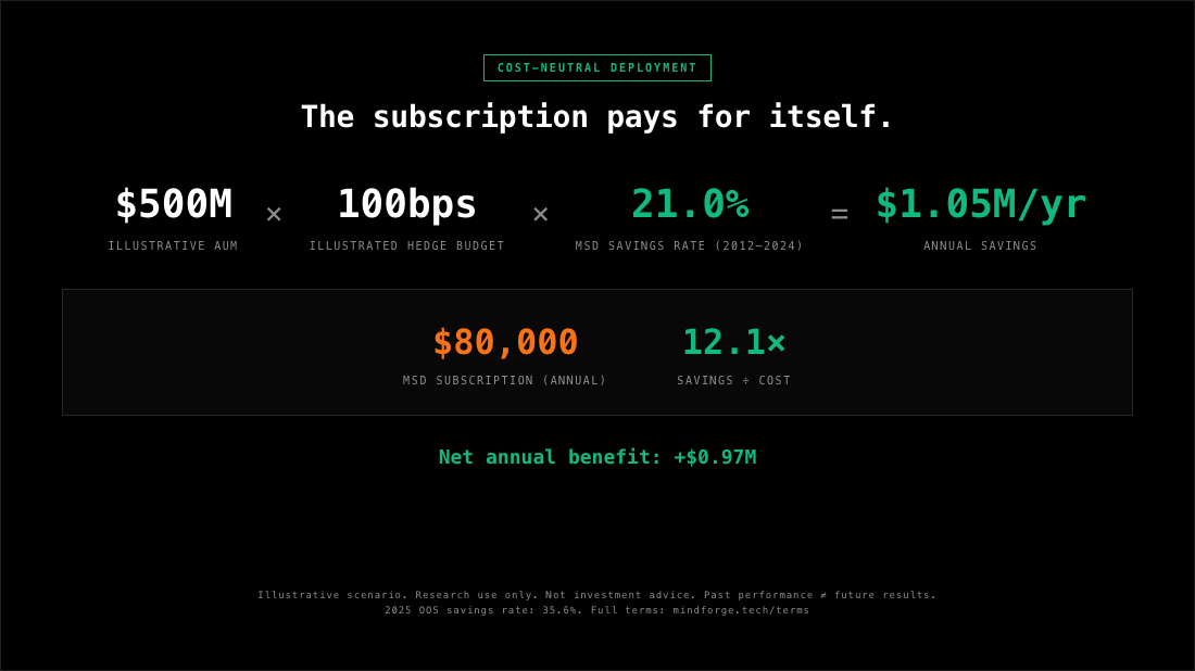 Backtested Calm-state hedge savings (~21%/yr baseline; 35.6% in 2025 OOS) can offset subscription cost. Stress detection adds per-event mitigation value.